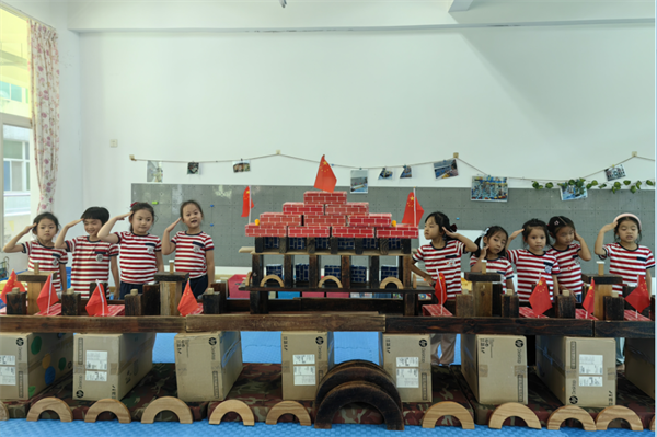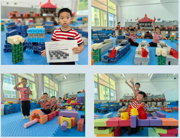 天安门广场的阅兵仪式历历在目,孩子们用自己的小手共同搭建“天安门”、“导弹车”、“坦克”等,再次呈现“大阅兵”场景。
