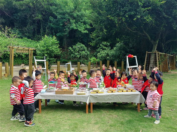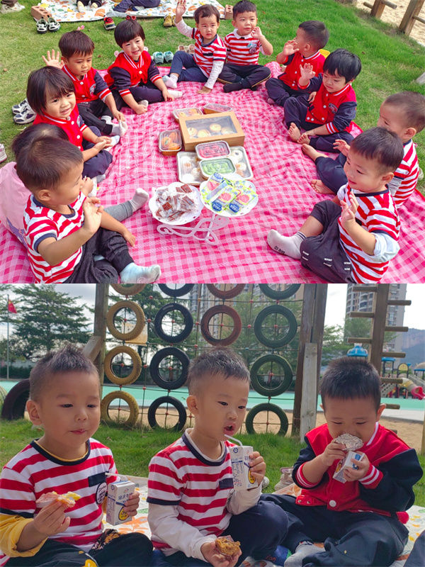 探索与游戏过后,一场温馨的秋日野餐在暖暖的阳光下开启。厨房叔叔阿姨们精心准备了美味可口的点心:香酥的蛋挞、营养的核桃包、流沙包、紫薯包,以及孩子们喜爱的小山楂棒、米饼、小小猪肉脯等健康零食,再配以清甜的葡萄和小西红柿,为孩子们及时补充能量,也让他们体验了与同伴分享的乐趣。