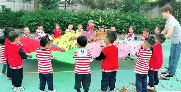 收集到的落叶,成了最好的游戏伙伴。在欢快的音乐中,孩子们共同撑起彩虹伞,让五彩的落叶在伞上翩翩起舞。他们笑着、跳着,在合作与互动中,更深刻地感受到了集体游戏的快乐与团队协作的魅力。