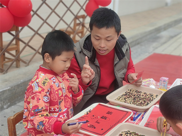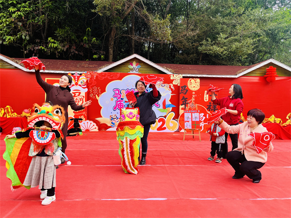 “马到福来”丰收园里,小蜜蜂农场、小水渠、野趣园等场地成了孩子们的乐园。孩子们通过摸箱抽取任务卡,在家长陪伴下,进入小蜜蜂农场进行科学探究类、劳作类的挑战任务。最后集大小朋友的智慧和辛勤的汗水赚取象征收获的“福币”,深刻体会劳动的价值与快乐。博物院民俗体验游戏区则是传统文化的体验场,孩子们在老师和志愿者的指导下,参与写福字、剪窗花、书春联、做灯笼、捞彩头等民俗活动,还能欣赏文物相关展示。优质社区资源与高校资源的融入,让孩子们在动手创作中近距离感受传统文化的博大精深,让文化种子在童趣中生根发芽。“龙马精神”大舞台内,舞龙舞狮等经典项目吸引众多孩子。家长和幼儿在游戏中配合默契、收获了欢声笑语。